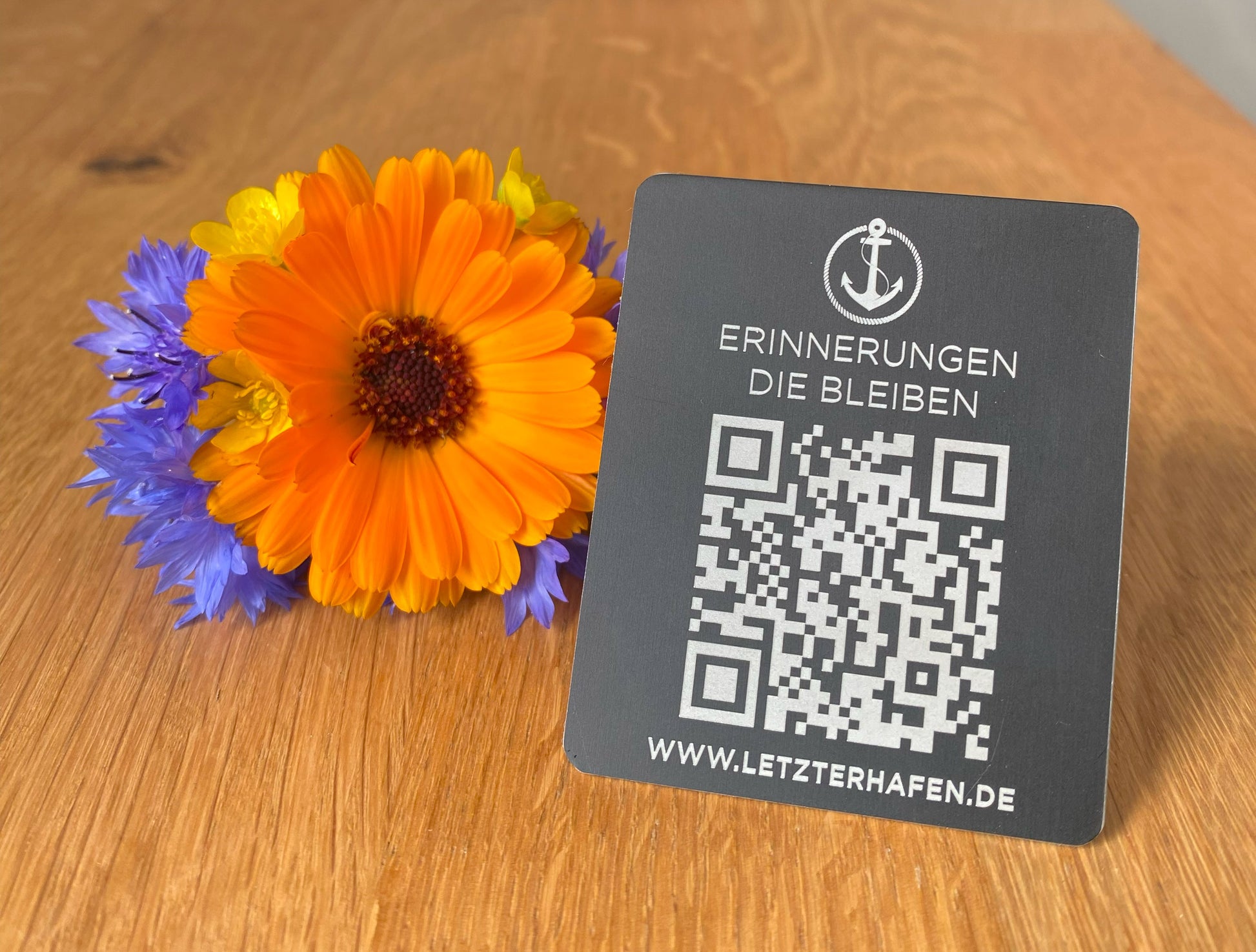 Die robuste Aluminiumplatte misst 50 mm × 60 mm und trägt den QR-Code, der jederzeit abrufbar ist. Im Bereich „Erinnerungen, die bleiben“ können Sie einen eigenen, ganz persönlichen Text wählen, der direkt auf der Platte verewigt wird.